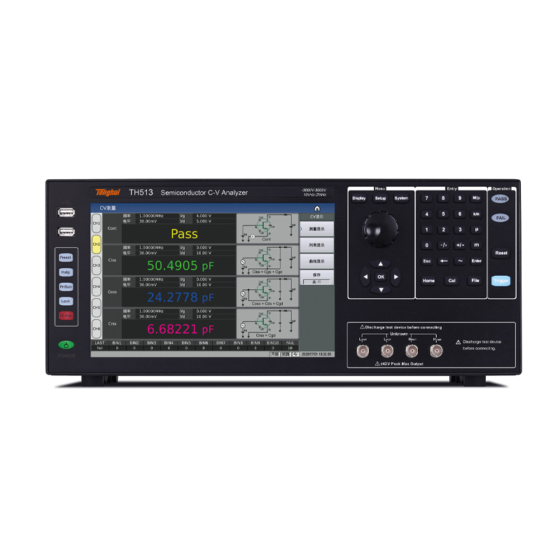 TH510系列半导体C-V特性分析仪是常州同惠电子根据当前半导体功率器件发展趋势,针对半导体材料及功率器件设计的分析仪器。仪器采用了一体化集成设计,二极管、三极管、MOS管及IGBT等半导体功率器件寄生电容、CV特性可一键测试,无需频繁切换接线及设置参数,单管功率器件及模组功率器件均可一键快速测试,适用于生产线快速测试、自动化集成。CV曲线扫描分析能力亦能满足实验室对半导体材料及功率器件的研发及分析(此功能为选件)。仪器设计频率为1kHz-2MHz,Vgs电压可达±40V,VDS电压可达±200V/±1500V/±3000V,足以满足大多数功率器件测试。