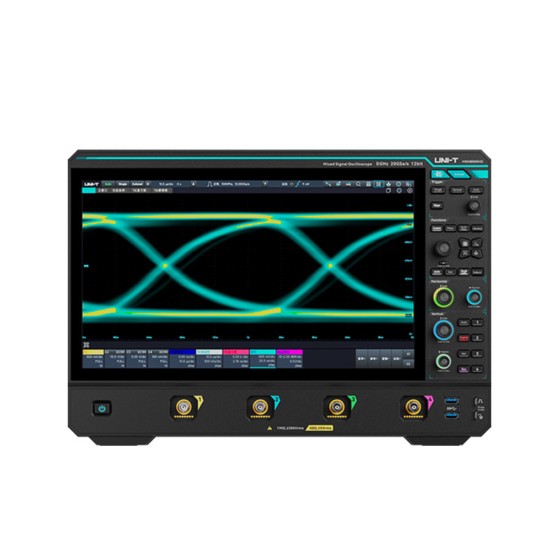 欢迎了解全新的MSO8000HD系列高分辨率示波器,本系列提供8GHz/5GHz两种带宽选择,全系标配20GSa/s采样率,12bit垂直分辨率,搭载了优利德自主研发示波器模拟前端芯片组,实质优化示波器性能和本底噪声,在高速及高动态范围信号测试中极具优势。